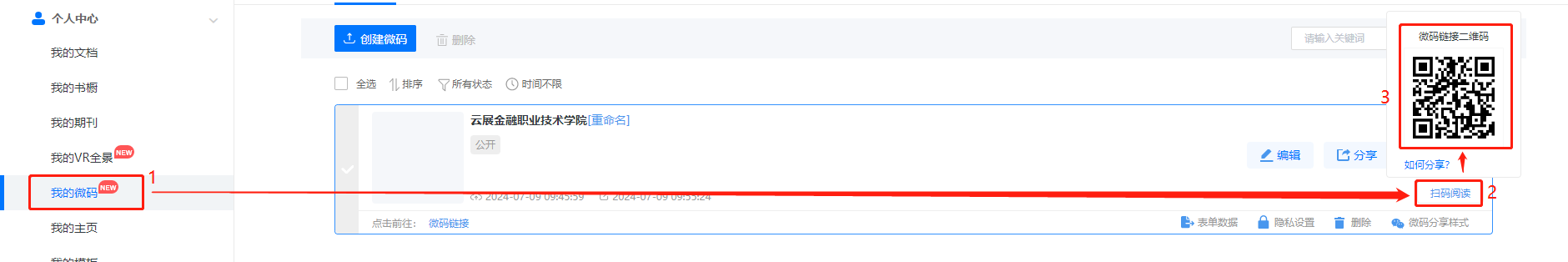 (1)點擊【我的微碼】,將鼠標移動到對應微碼的【掃碼閱讀】,便會出現二維碼。
