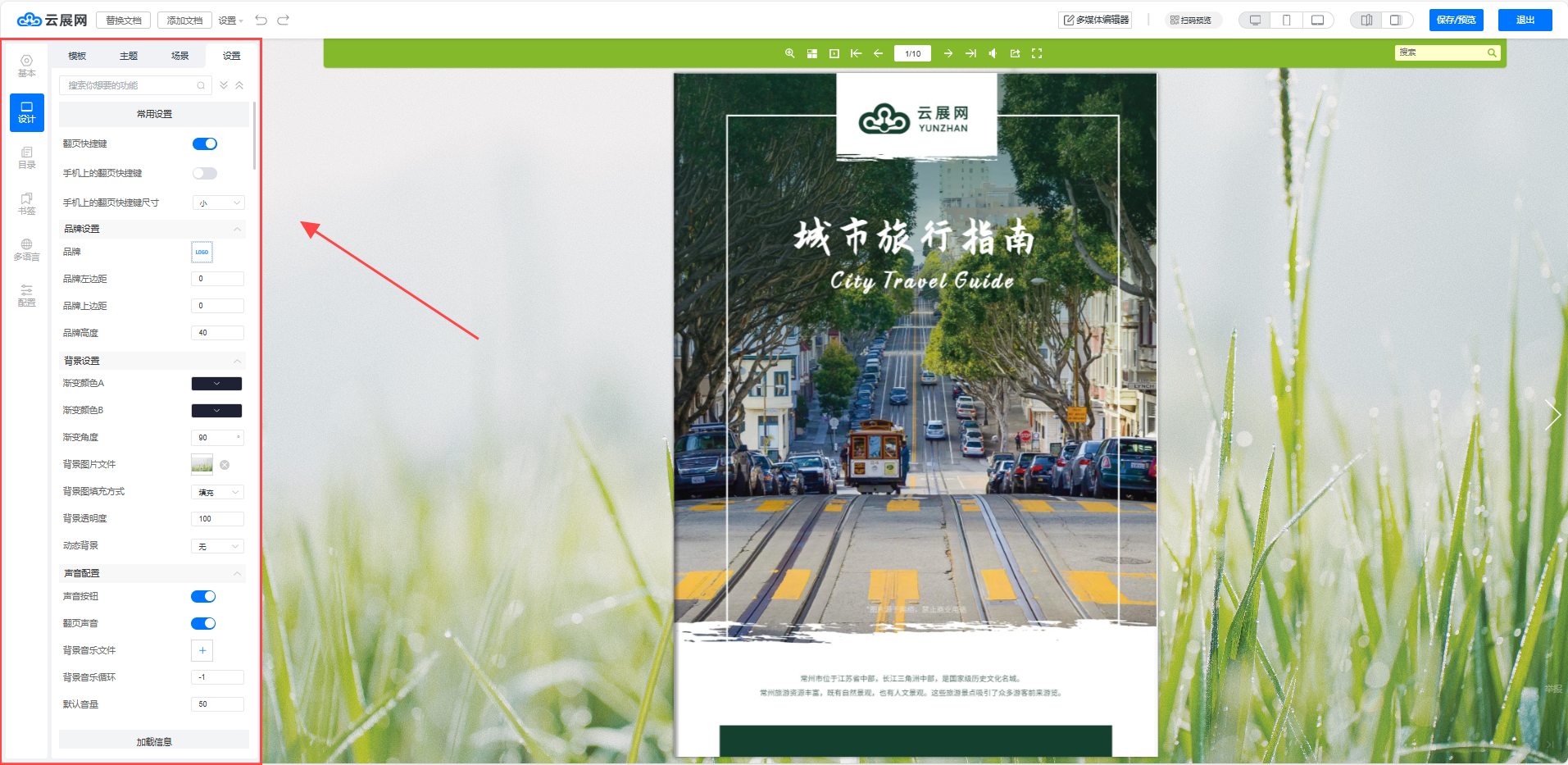 你也可以在右側(cè)設(shè)置電子書(shū)的樣式、LOGO、閱讀權(quán)限、背景音樂(lè)、背景圖片等設(shè)置,或是添加目錄、更改書(shū)頁(yè)厚度以及書(shū)頁(yè)陰影等外觀設(shè)置。