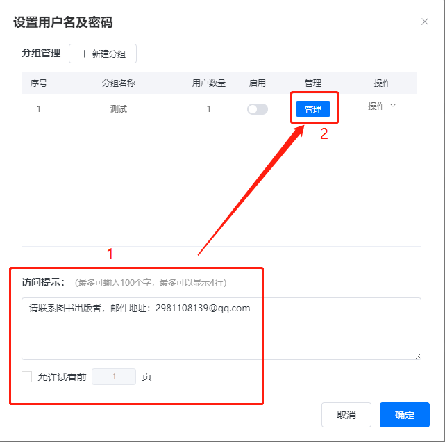 先在下方設(shè)置【訪(fǎng)問(wèn)提示】以及允許查看前幾頁(yè),然后點(diǎn)擊【管理】。