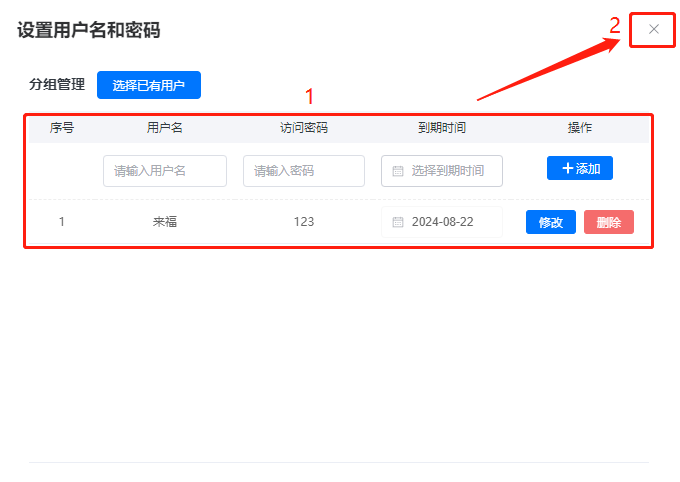 輸入【用戶(hù)名】、【密碼】,設(shè)置到期時(shí)間,點(diǎn)擊【添加】后,可以在下方看到創(chuàng)建好的用戶(hù)名和密碼,然后點(diǎn)擊右上角的【x】關(guān)閉界面。