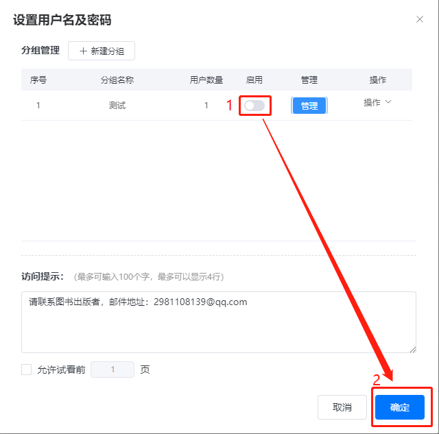 打開(kāi)【啟用】,點(diǎn)擊【確定】,讀者便需要輸入正確的用戶(hù)名和密碼才能觀(guān)看書(shū)本。