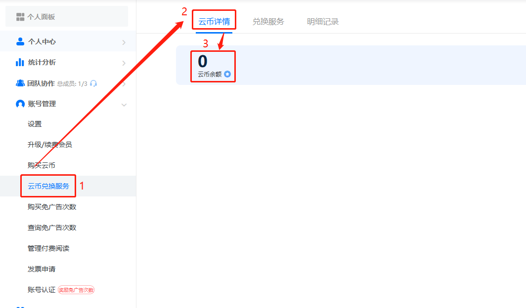點(diǎn)擊【云幣兌換服務(wù)】,再點(diǎn)擊【云幣詳情】,即可查看當(dāng)前云幣余額。