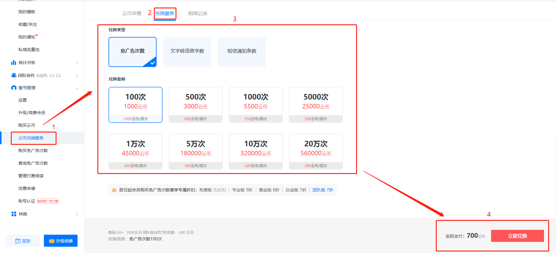 點(diǎn)擊【云幣兌換服務(wù)】,再點(diǎn)擊【兌換服務(wù)】,選擇需要的類型和套餐,然后右下方點(diǎn)擊立即兌換,最后點(diǎn)擊彈出的詳情框的兌換即可。