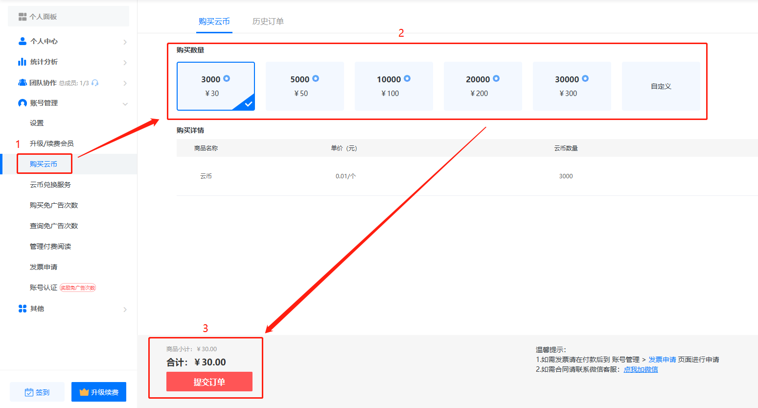 點(diǎn)擊【購買云幣】,選擇購買數(shù)量,下方提交訂單付款即可。