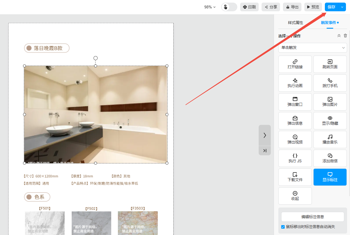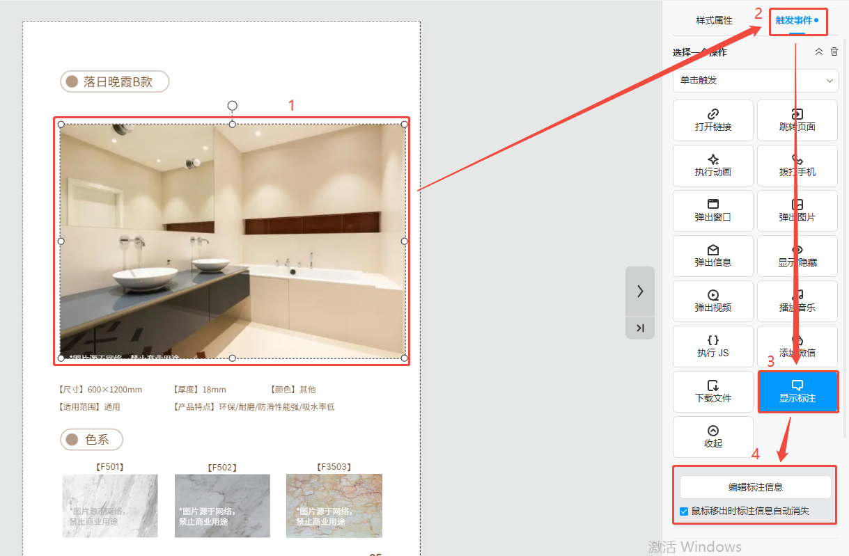 選中需要點擊顯示標注的文字或者圖片,然后在【觸發(fā)事件】選擇【顯示標注】,點擊【編輯標注信息】。