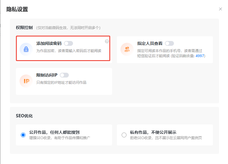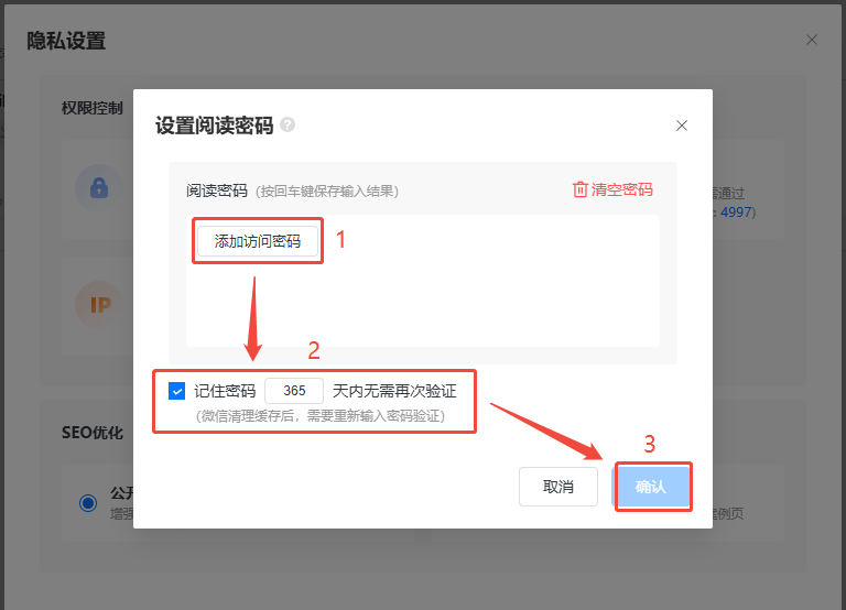 點(diǎn)擊【訪問密碼】輸入一個或者多個密碼,如果您希望讀者在設(shè)定的時間段內(nèi)再次訪問時無需重新輸入密碼驗(yàn)證,還可以選擇勾選下方的【記住密碼】,并設(shè)置密碼間隔時間,最后點(diǎn)擊【確認(rèn)】。