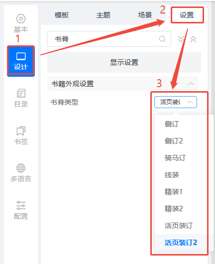 點擊【設(shè)計】,然后點擊【設(shè)置】,【書脊類型】選一個自己喜歡的。