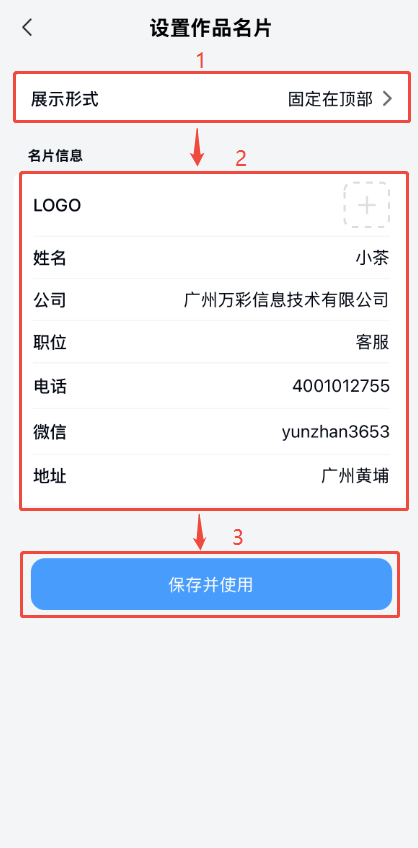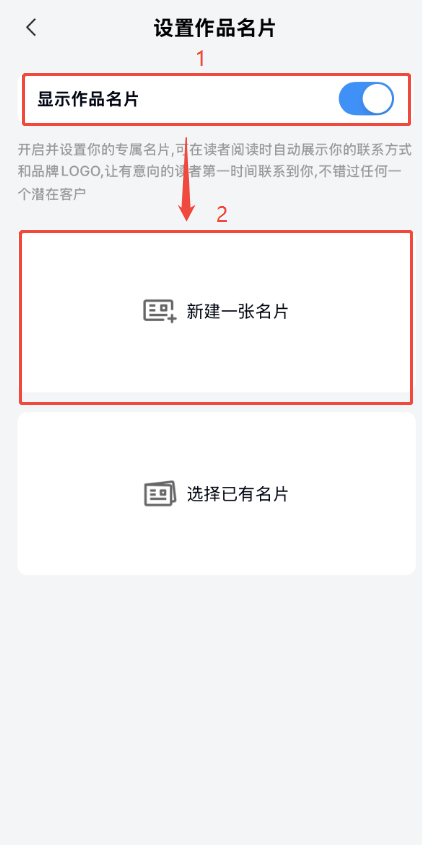 打開【顯示作品名片】,點擊下方【新建一張名片】創(chuàng)建名片,選擇需要的展示形式,完善名片信息后,點擊【保存并使用即可】。