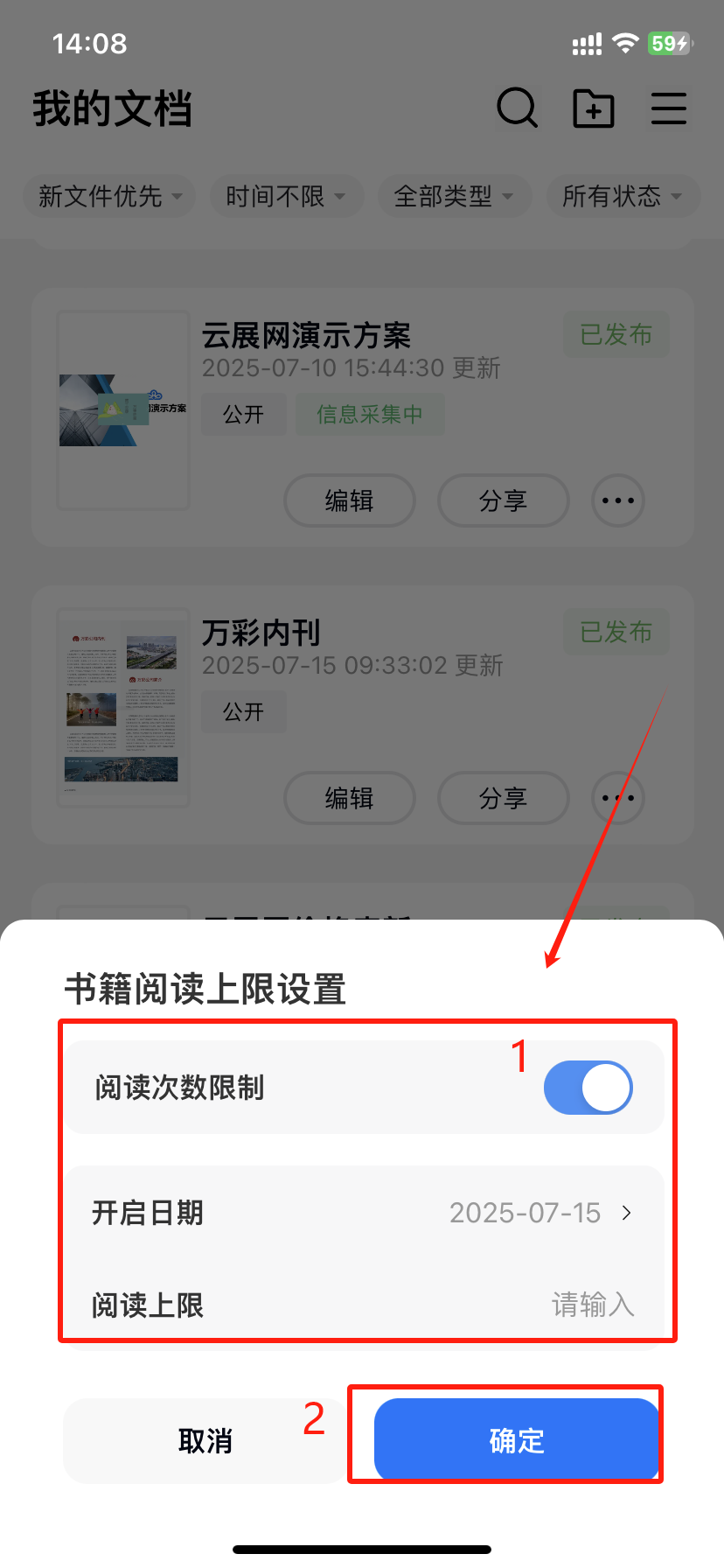 開啟【閱讀次數(shù)限制】,設(shè)置【開啟日期】以及設(shè)置【閱讀上限】次數(shù),設(shè)置好后,點擊【確定】