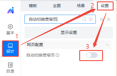 點擊【設(shè)計】,然后點擊【設(shè)置】,打開【自動切換寬窄頁】。