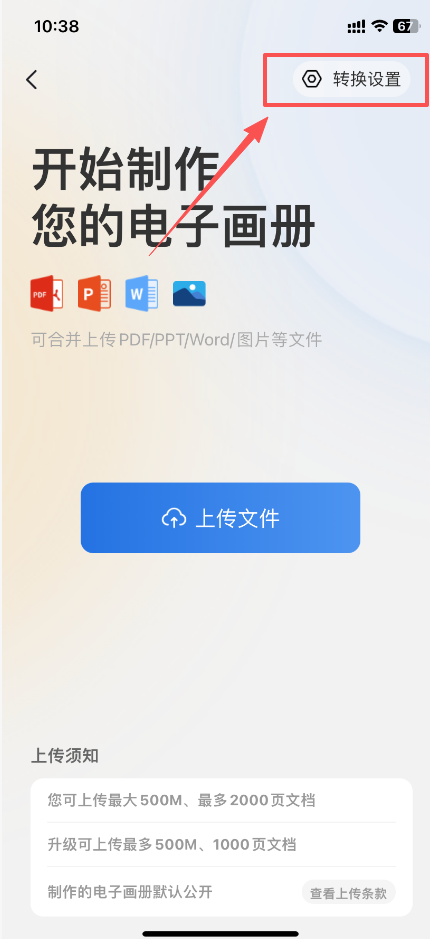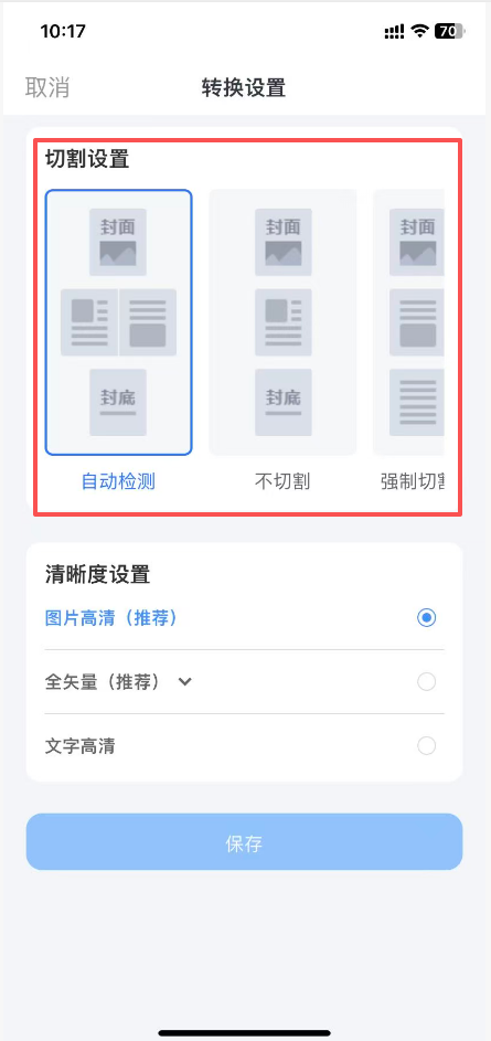 點擊【轉(zhuǎn)換設置】打開,選擇切割方式后,點擊【保存】,隨后繼續(xù)上傳文檔進行制作