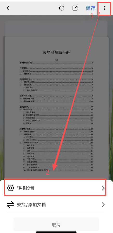 點擊右上角“三個點按鈕”,點擊【轉(zhuǎn)換設置】打開