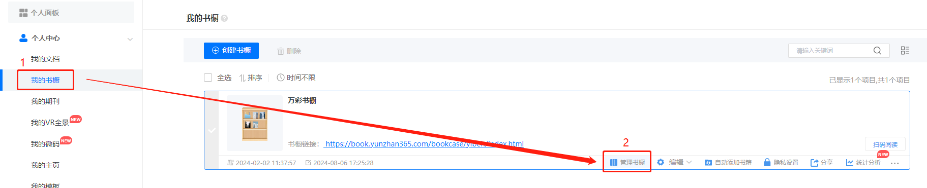 (1)點擊【我的書櫥】找到對應(yīng)書櫥,點擊【管理書櫥】,進(jìn)入管理書櫥界面。