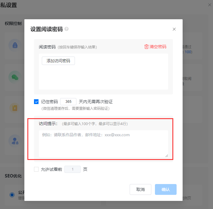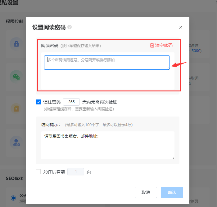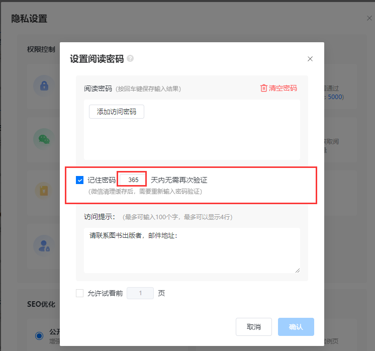 如果你希望讀者在設(shè)定的時(shí)間段內(nèi)再次訪問(wèn)時(shí)無(wú)需重新輸入密碼驗(yàn)證,可以選擇勾選“記住密碼”,并設(shè)置密碼間隔時(shí)間。