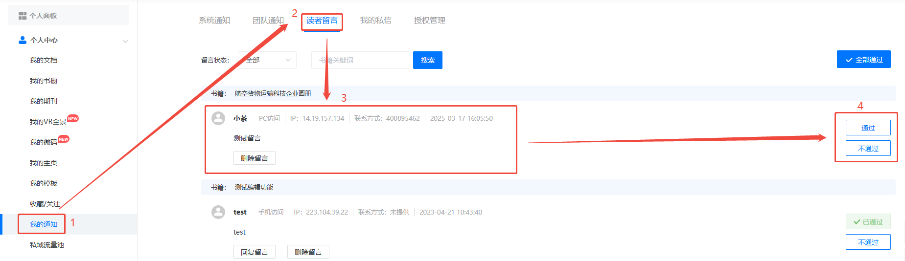 點擊【我的通知】,然后點擊【讀者留言】就可以看到讀者留下的留言,姓名,聯(lián)系方式,在右側(cè)選擇通過或者不通過。
