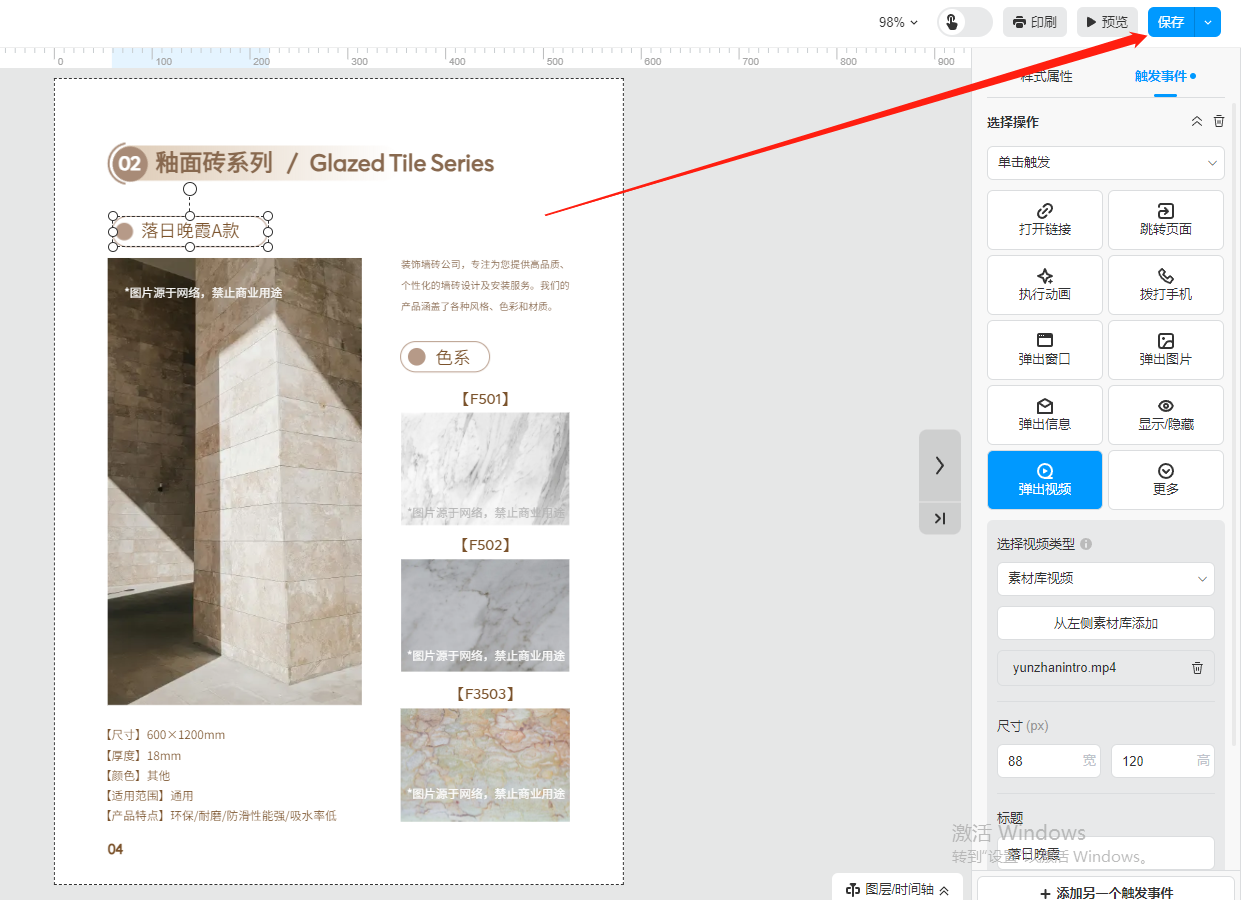 選中需要彈出視頻的文字或者圖片,然后在【觸發(fā)事件】選擇【彈出視頻】,選擇視頻類型。
