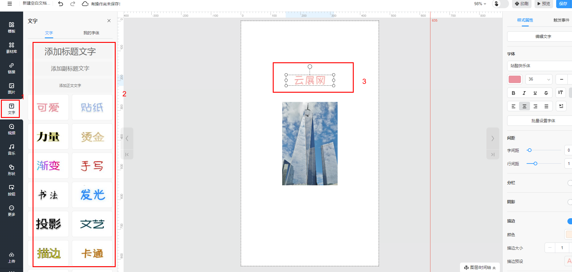 選擇【文字】進(jìn)入文字界面,單擊/拖拽文字類型添至電子書頁(yè)面,并雙擊文字框輸入文本內(nèi)容。也可以選擇云展提供的藝術(shù)字進(jìn)行設(shè)計(jì)。
