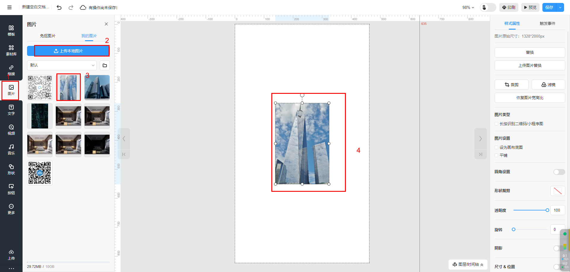 選擇【圖片】進(jìn)入圖片界面,可以上傳你本地的圖片,上傳圖片后選中圖片添至電子書頁(yè)面,通過鼠標(biāo)拖拽調(diào)整圖片的位置大小。