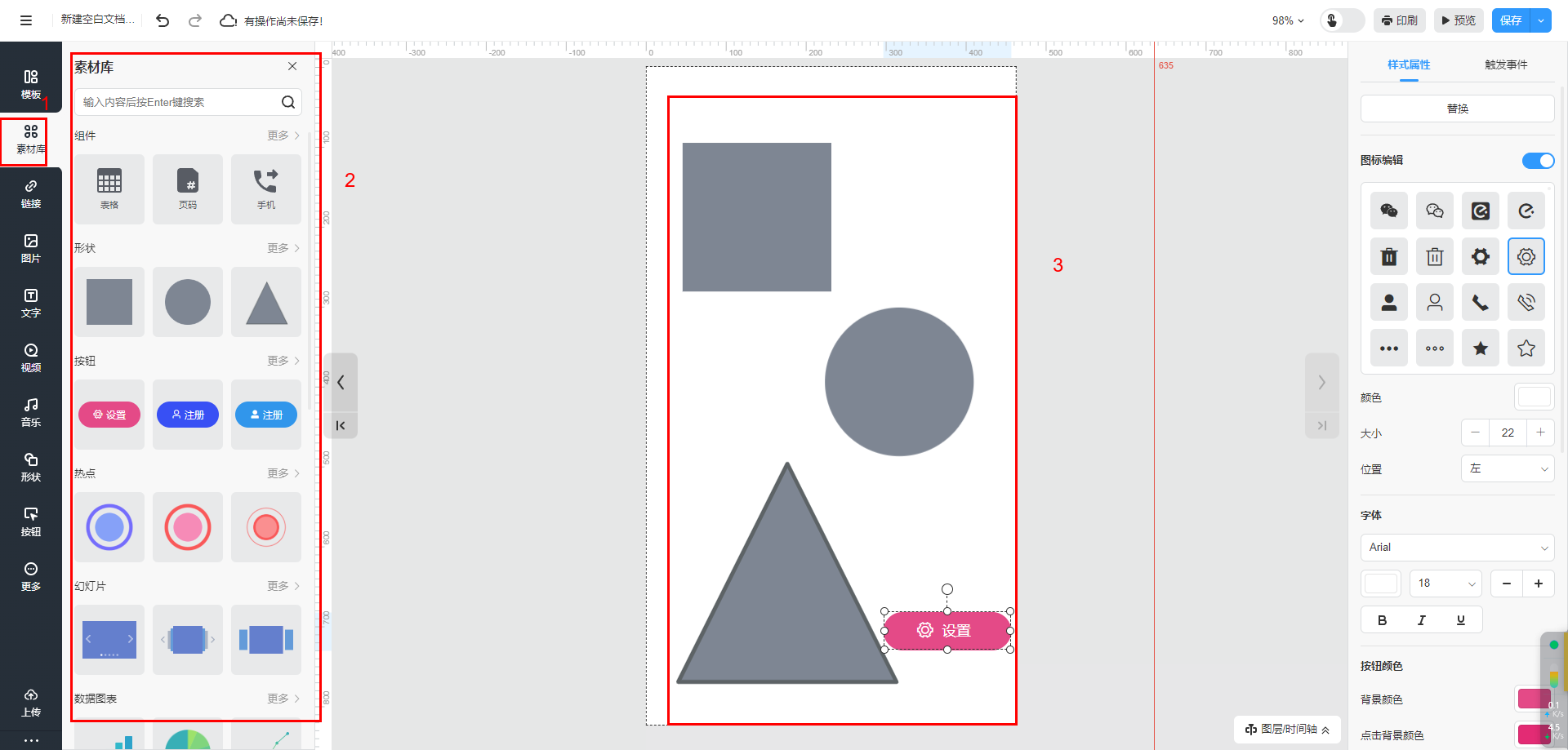 選擇【素材庫(kù)】進(jìn)入素材界面,選擇素材類型,單擊/拖拽素材添至電子書頁(yè)面,并可設(shè)置素材顏色、位置、大小等。
