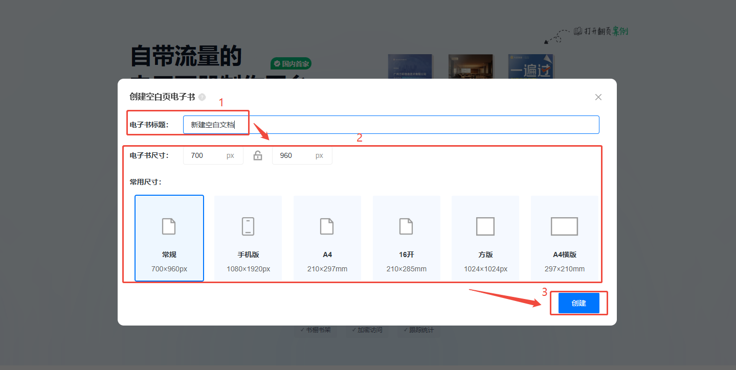 輸入電子書標(biāo)題并選擇尺寸,并點(diǎn)擊【創(chuàng)建】。在這里設(shè)置標(biāo)題與尺寸,你可以選擇平臺(tái)預(yù)設(shè)尺寸,也可以根據(jù)需求設(shè)置你需要的尺寸大小。