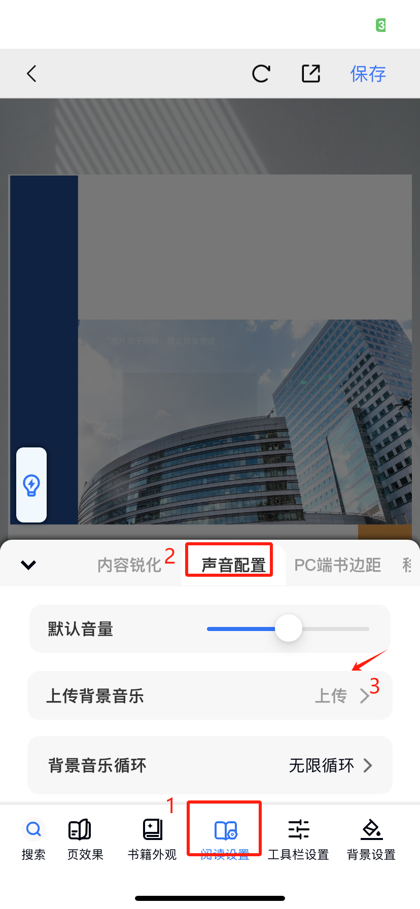 在【閱讀設置】,點擊【聲音配置】,點擊【上傳背景音樂】上傳mp3格式的音樂文件