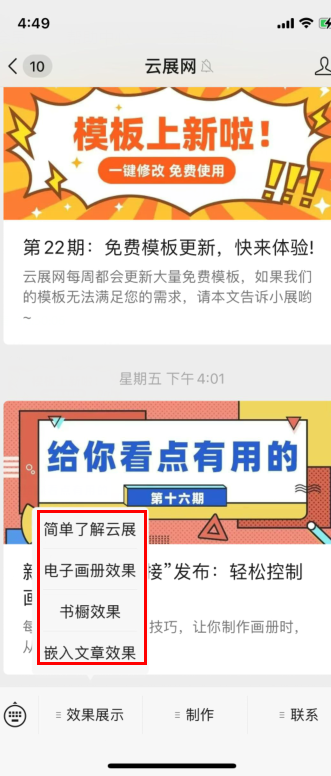 您可以把云展網(wǎng)生成的電子書/書櫥分享到微信公眾號上,提高曝光率讓更多人看到,把電子書/書櫥放到公眾號讓讀者閱讀,有四種展現(xiàn)形式。