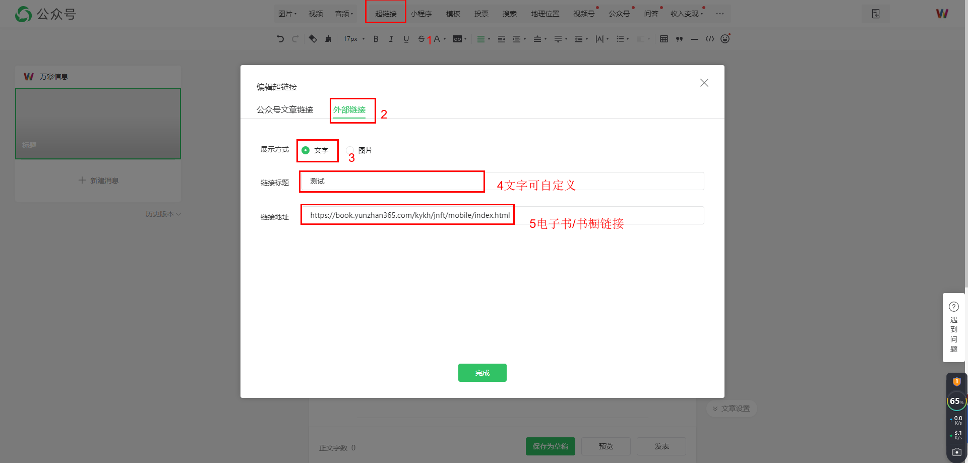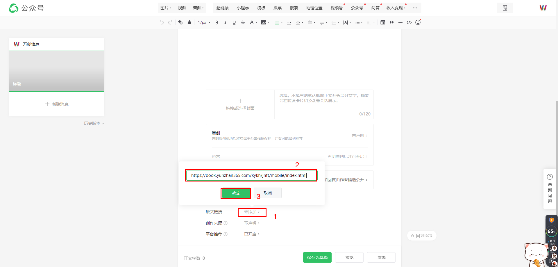 1、在發(fā)布的公眾號文章里,添加電子書/書櫥的鏈接為”原文鏈接”。