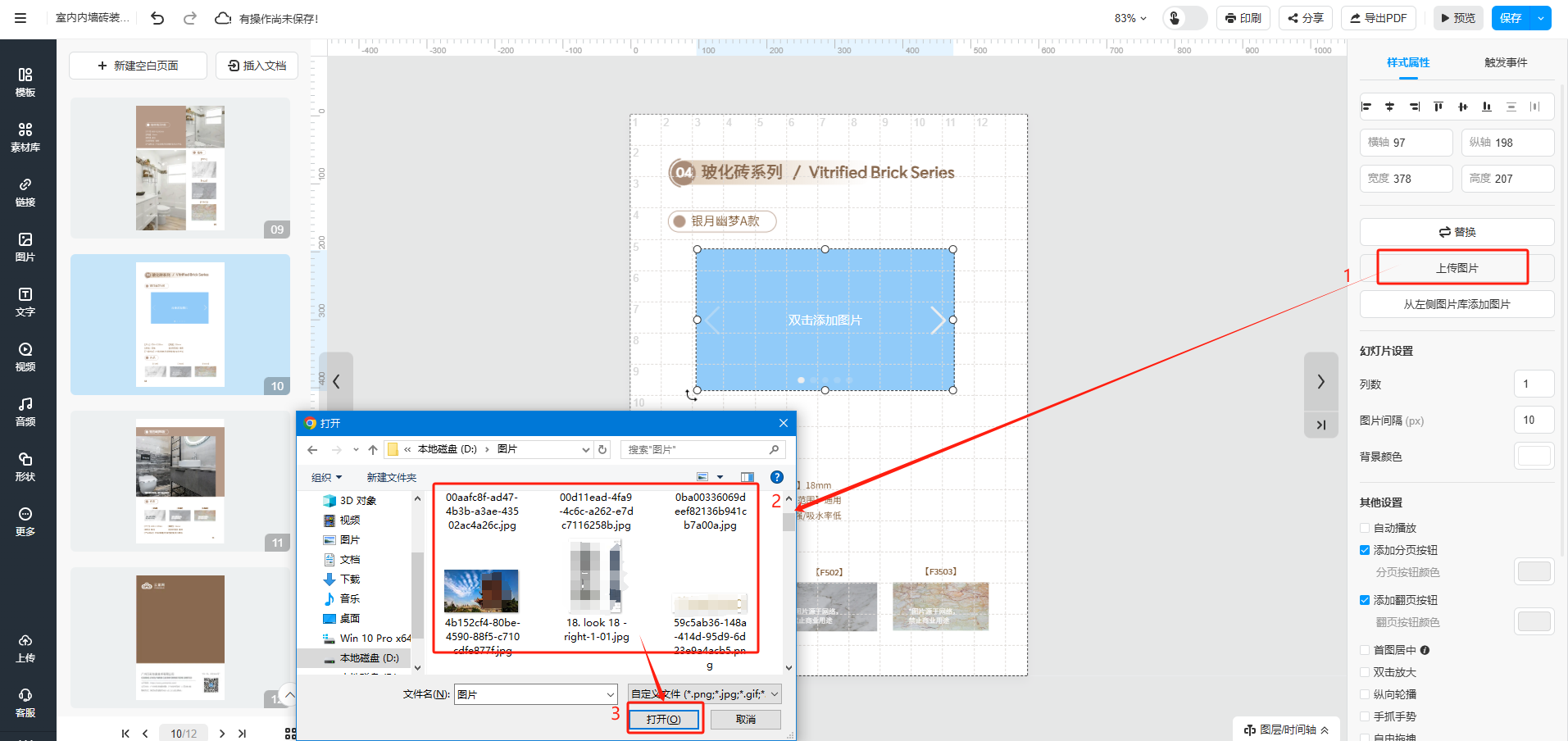 點(diǎn)擊【上傳圖片】,選擇圖片后,點(diǎn)擊【打開】,將圖片添加到幻燈片中