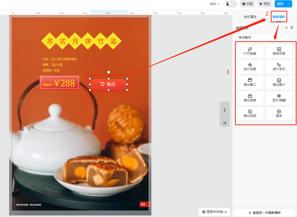 選中功能按鈕,點擊右上角【觸發(fā)事件】,選擇事件。