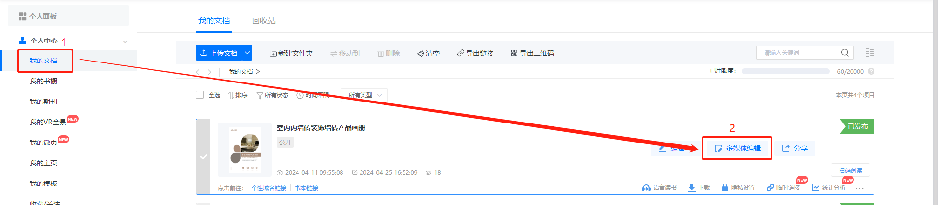 點進【我的文檔】/【文檔】,選擇對應(yīng)電子書,點擊【多媒體編輯】/【內(nèi)容編輯】。
