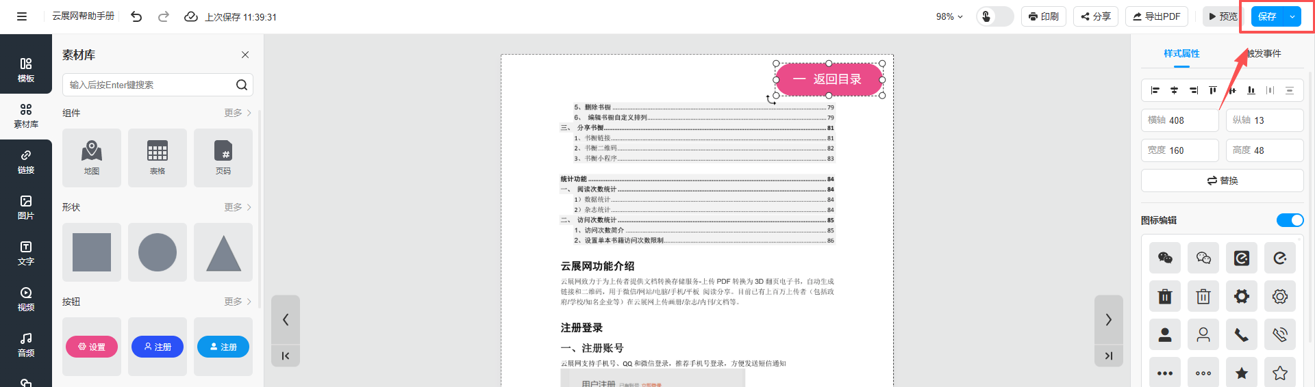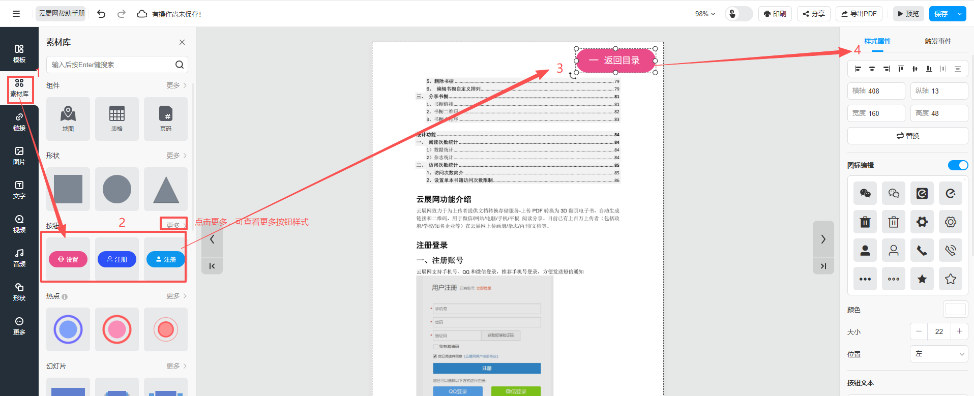2、點擊【素材庫】,點擊按鈕,在頁面合適的位置添加功能按鈕,雙擊按鈕上的文字將其更改為“返回目錄”,右側(cè)可更改圖標樣式和按鈕樣式。