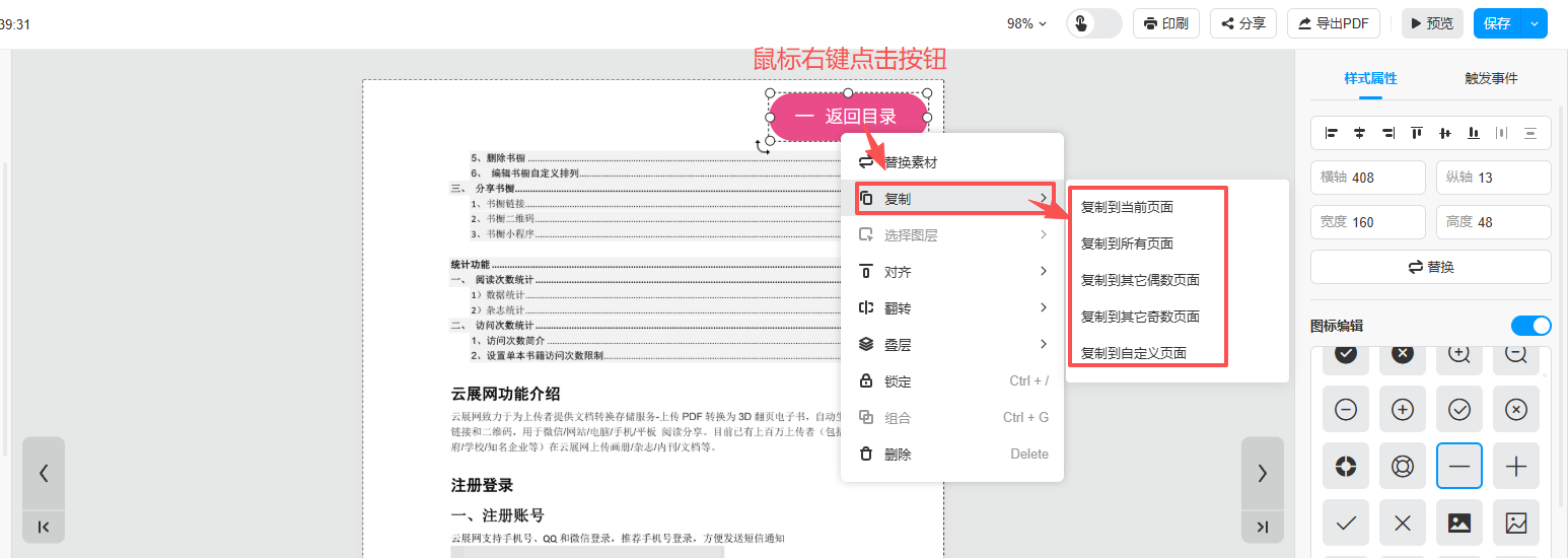 4、右鍵點擊返回目錄按鈕,將其復制到除了封面封底以及目錄頁以外的其他頁面,因為復制的按鈕位置是統(tǒng)一的,所以排版的時候需要在每一頁給按鈕留個位置。