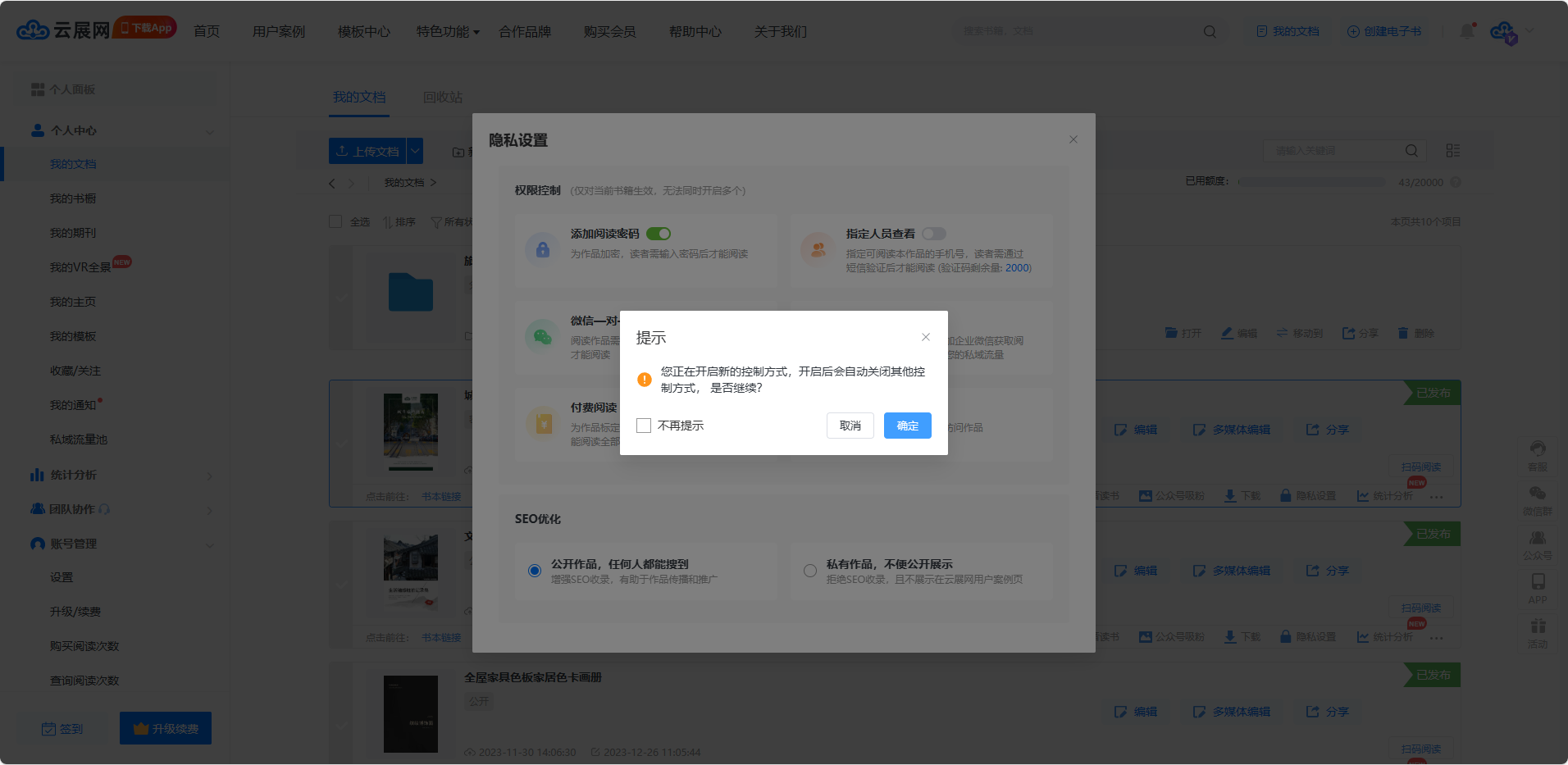 找到你需要設(shè)置微信一對(duì)一授權(quán)的電子書,點(diǎn)擊【隱私設(shè)置】,勾選【微信一對(duì)一授權(quán)】彈出彈窗后,根據(jù)你的需要勾選選項(xiàng),點(diǎn)擊【確定】即可。