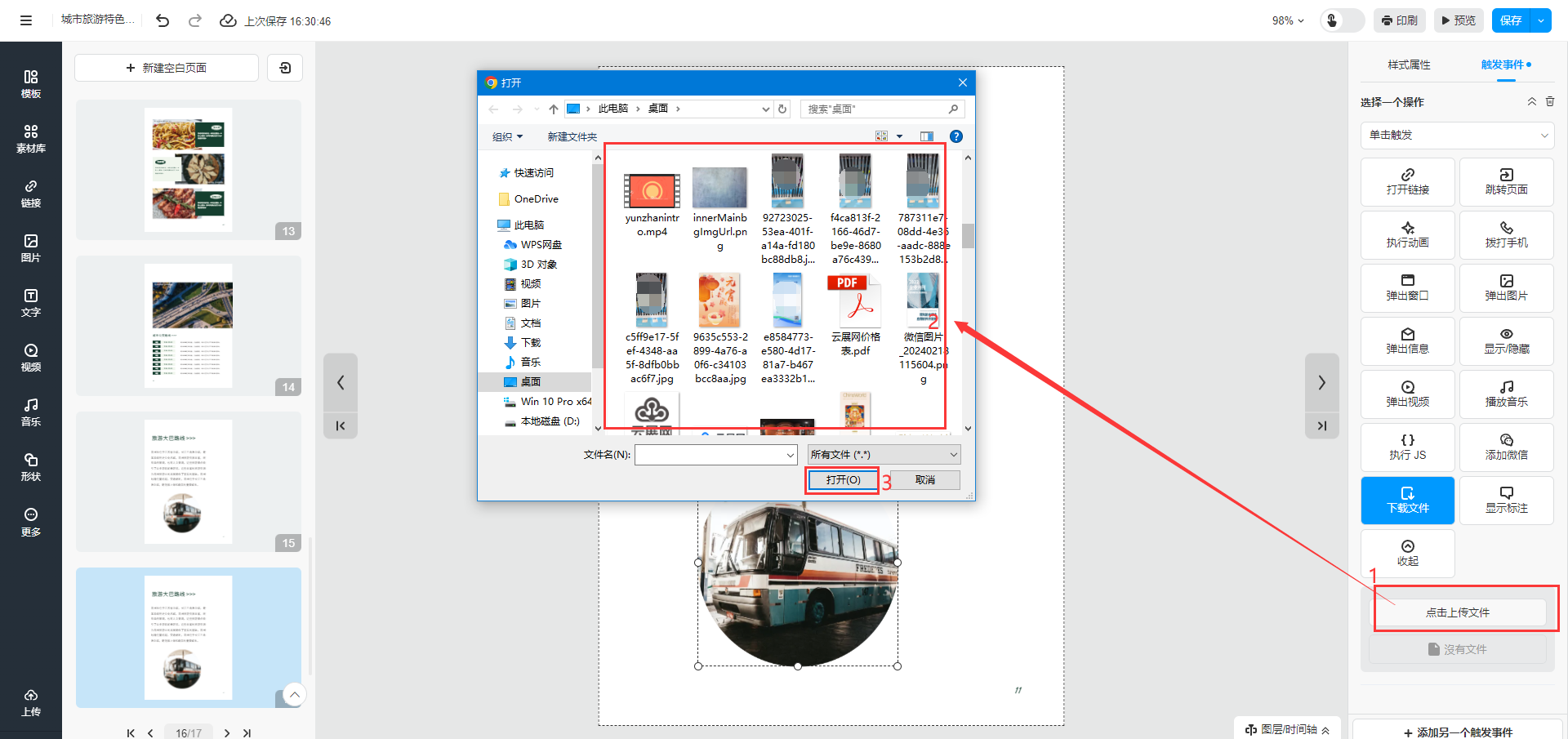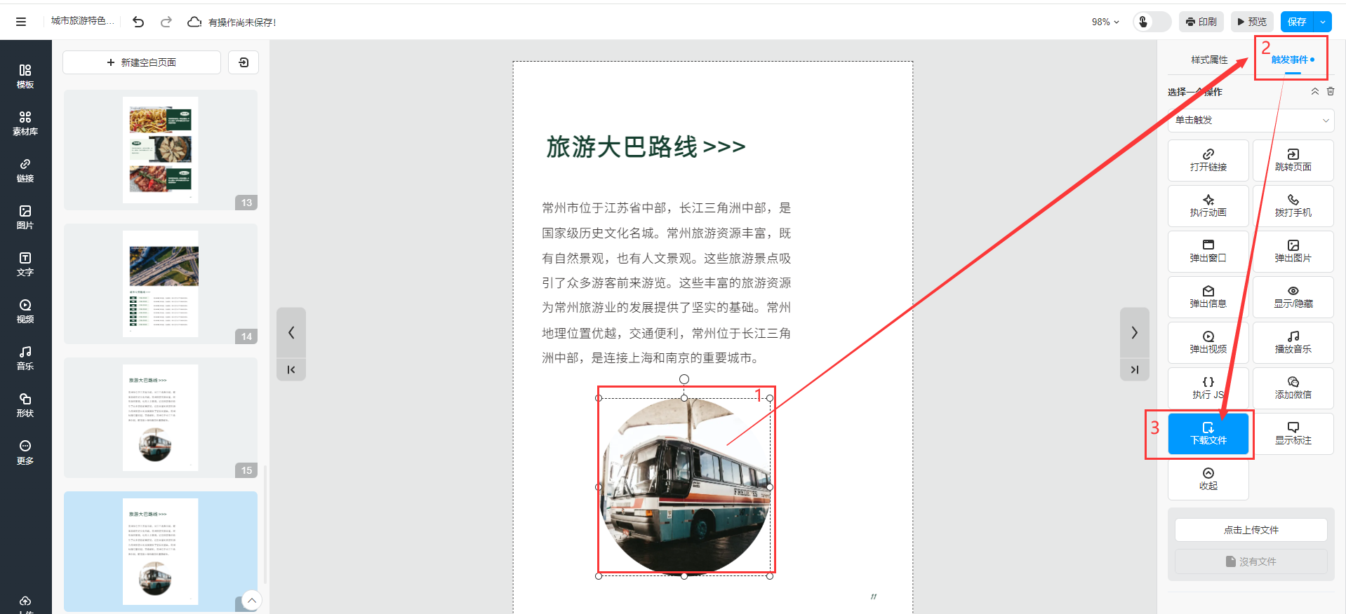 選中需要添加附件的文字或者圖片,點(diǎn)擊【觸發(fā)事件】,選擇【下載文件】