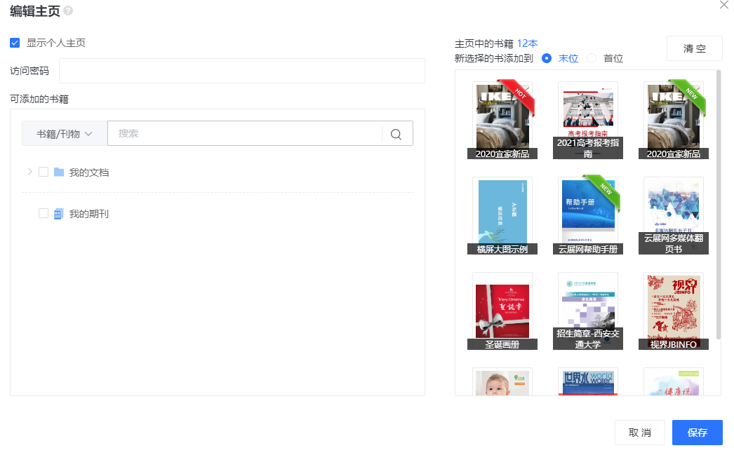 2、彈出編輯窗口后,點(diǎn)擊文件夾,勾選需要展示的書籍并保存,設(shè)置私有的雜志將不會展示在主頁。
