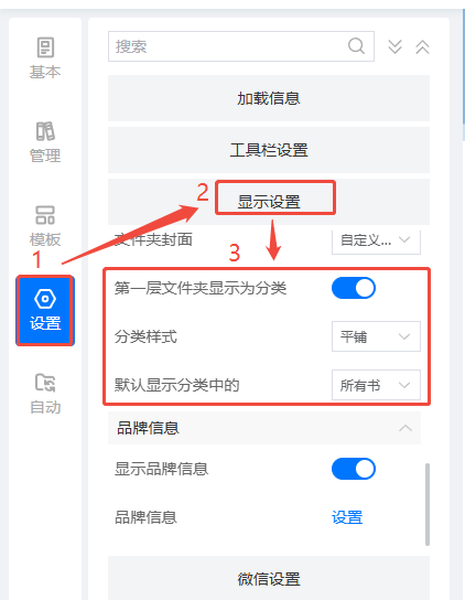 點擊【設置】,打開【顯示設置】,找到并打開【第一層文件夾顯示為分類】。