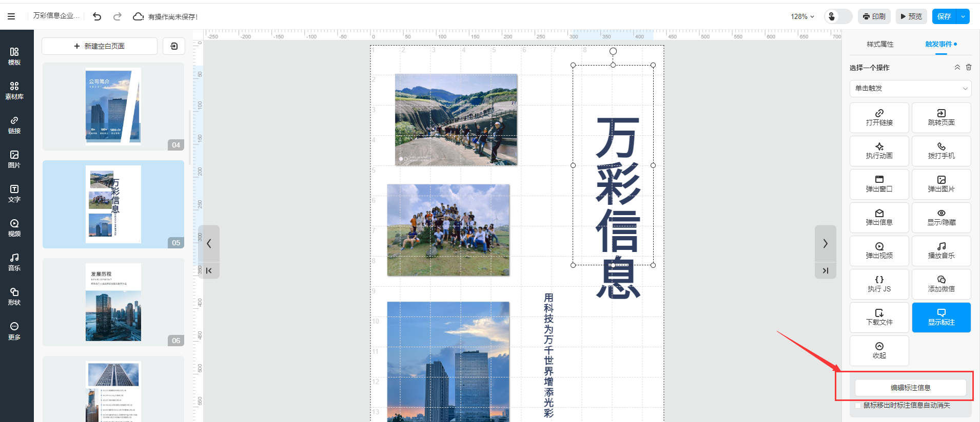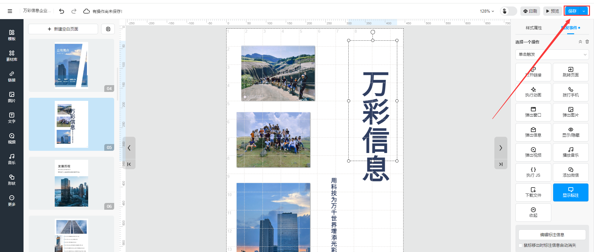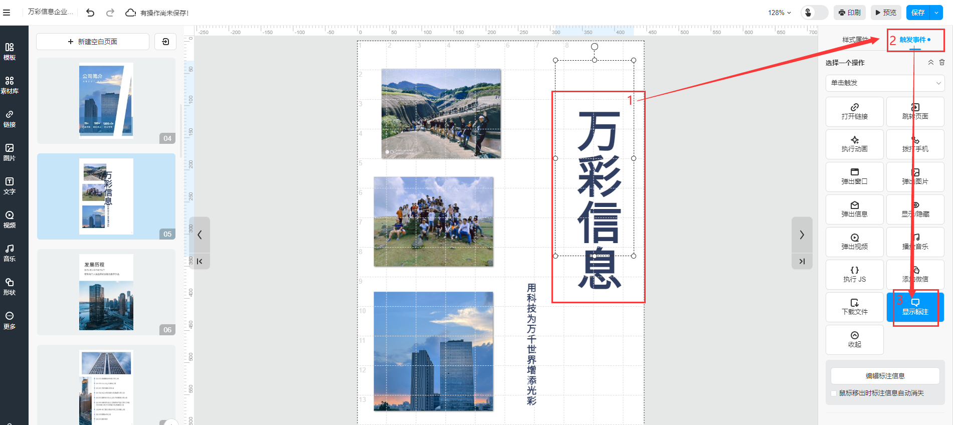 選擇圖片/文字/圖標,點擊【觸發(fā)事件】,對其設(shè)置【顯示標注】功能
