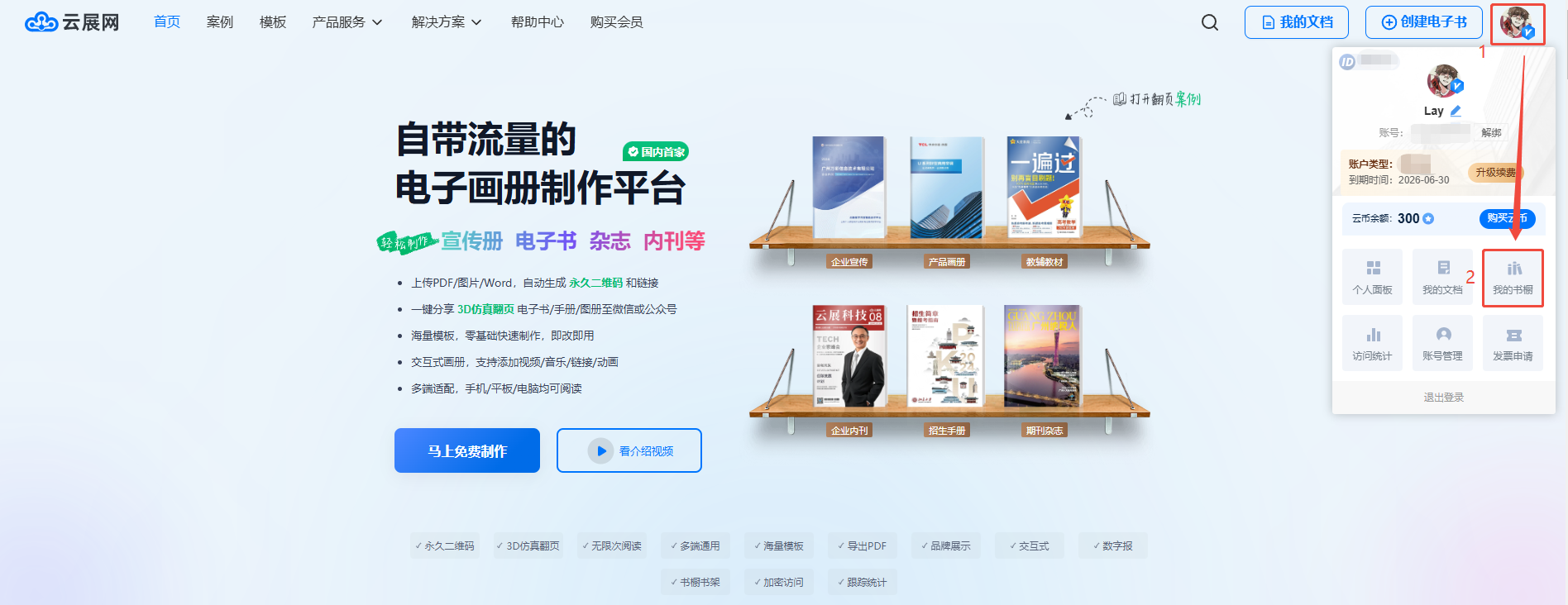將鼠標(biāo)懸停在云展網(wǎng)首頁右上角我的賬號上,點(diǎn)擊【我的書櫥】進(jìn)入界面。