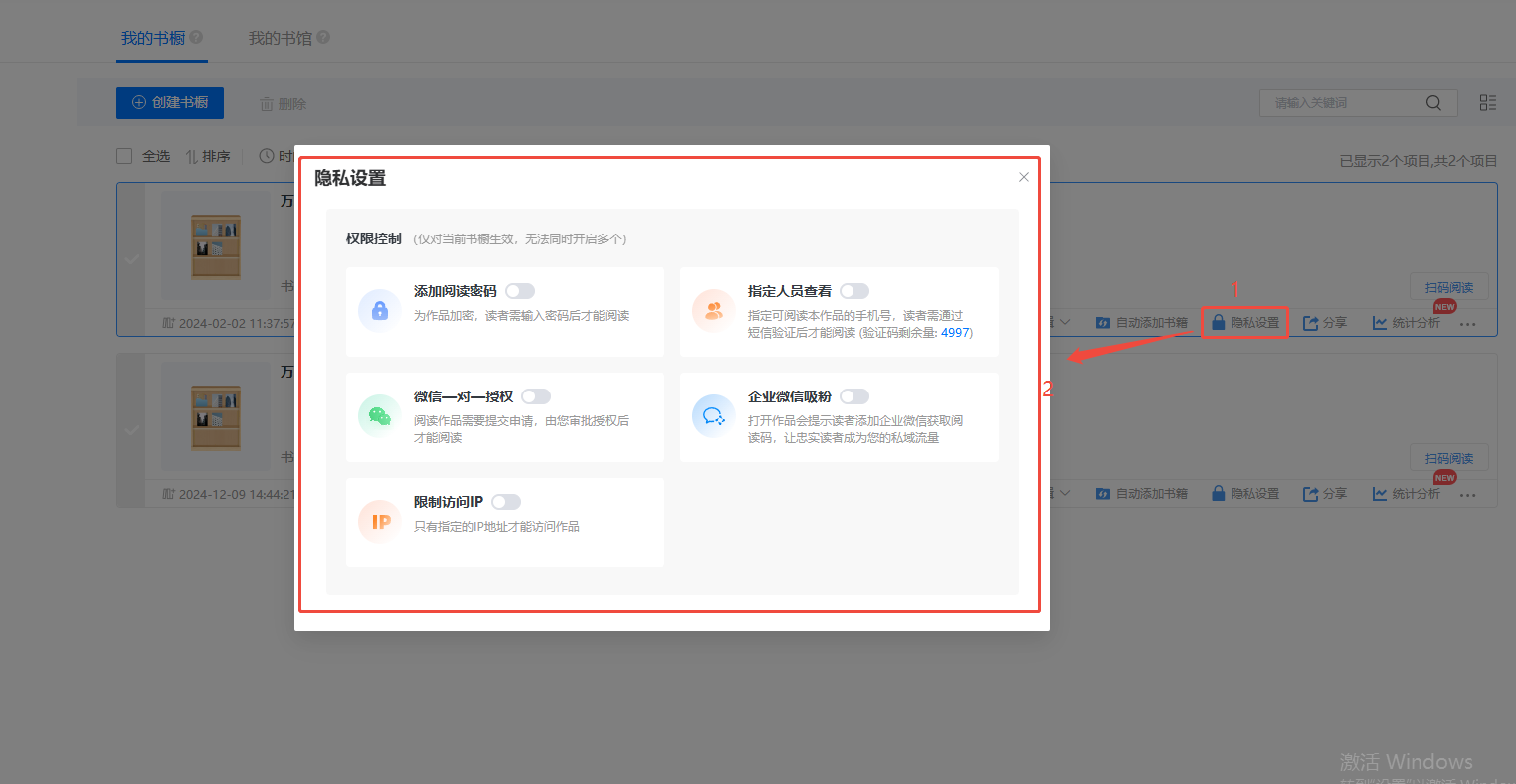 找到要設(shè)置的書櫥,點(diǎn)擊【隱私設(shè)置】進(jìn)行設(shè)置,根據(jù)你的需要選擇隱私設(shè)置方式。