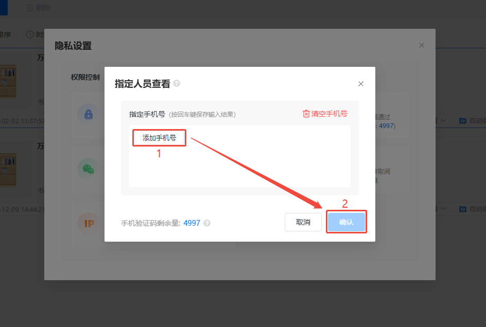 勾選【指定人員查看】彈出彈窗,點(diǎn)擊【添加手機(jī)號】輸入手機(jī)號后點(diǎn)擊【確定】即可。