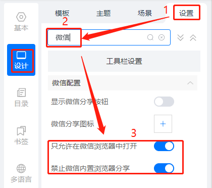 點(diǎn)擊【設(shè)計(jì)】,點(diǎn)擊【設(shè)置】,搜索框搜索【微信】,打開以下兩個(gè)配置
