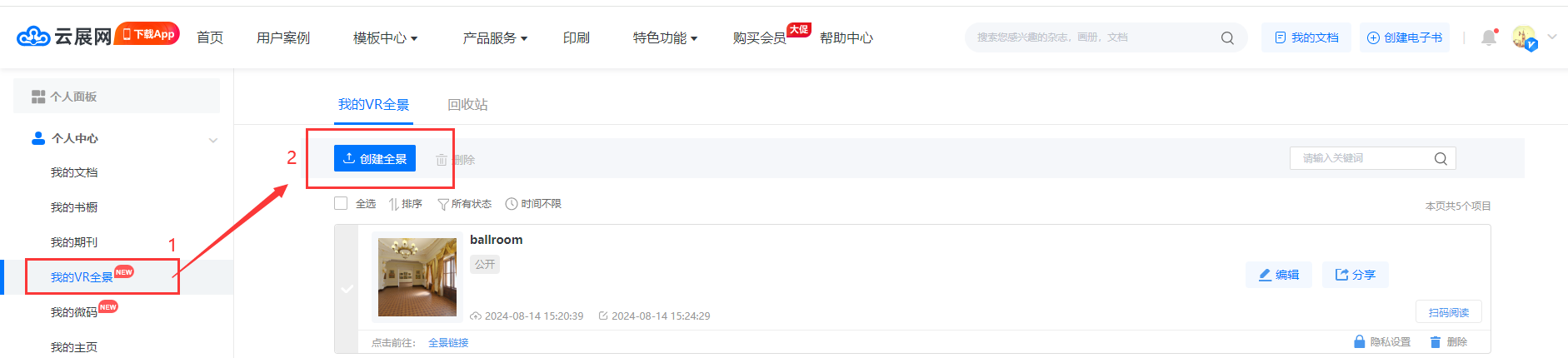 在【我的VR全景】頁(yè)面,點(diǎn)擊【創(chuàng)建全景】進(jìn)入編輯頁(yè)面