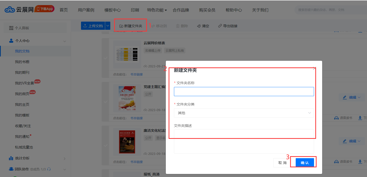 在【我的文檔】頁面–點擊【新建文件夾】–輸入文件夾信息–點擊【確認】