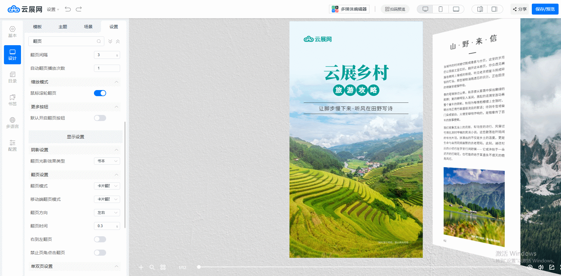 點(diǎn)擊【設(shè)計(jì)】中的【設(shè)置】,找到【翻頁設(shè)置】,根據(jù)你的需求選擇翻頁的模式、方向、時(shí)間等設(shè)置。