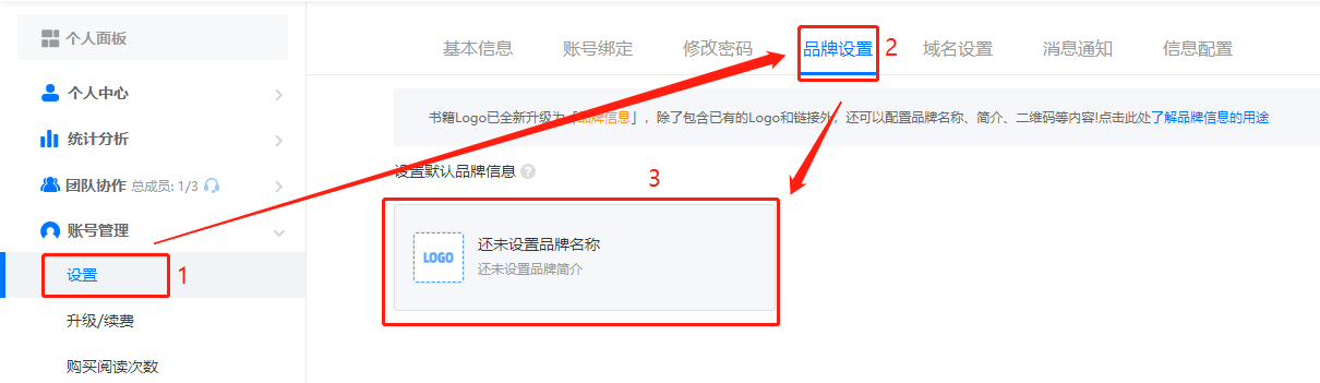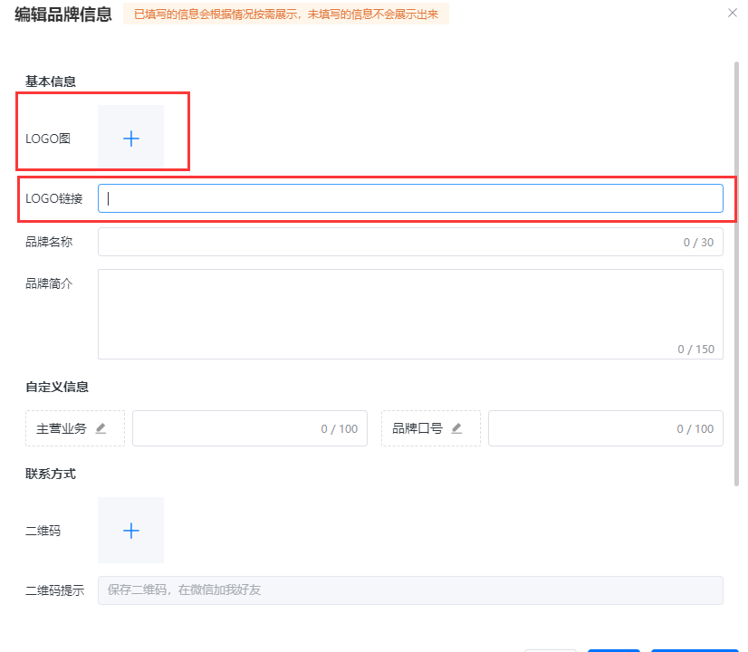 點(diǎn)擊【設(shè)置】,然后點(diǎn)擊【品牌設(shè)置】,創(chuàng)建品牌信息,并且只設(shè)置Logo圖和Logo鏈接,鏈接可以為空