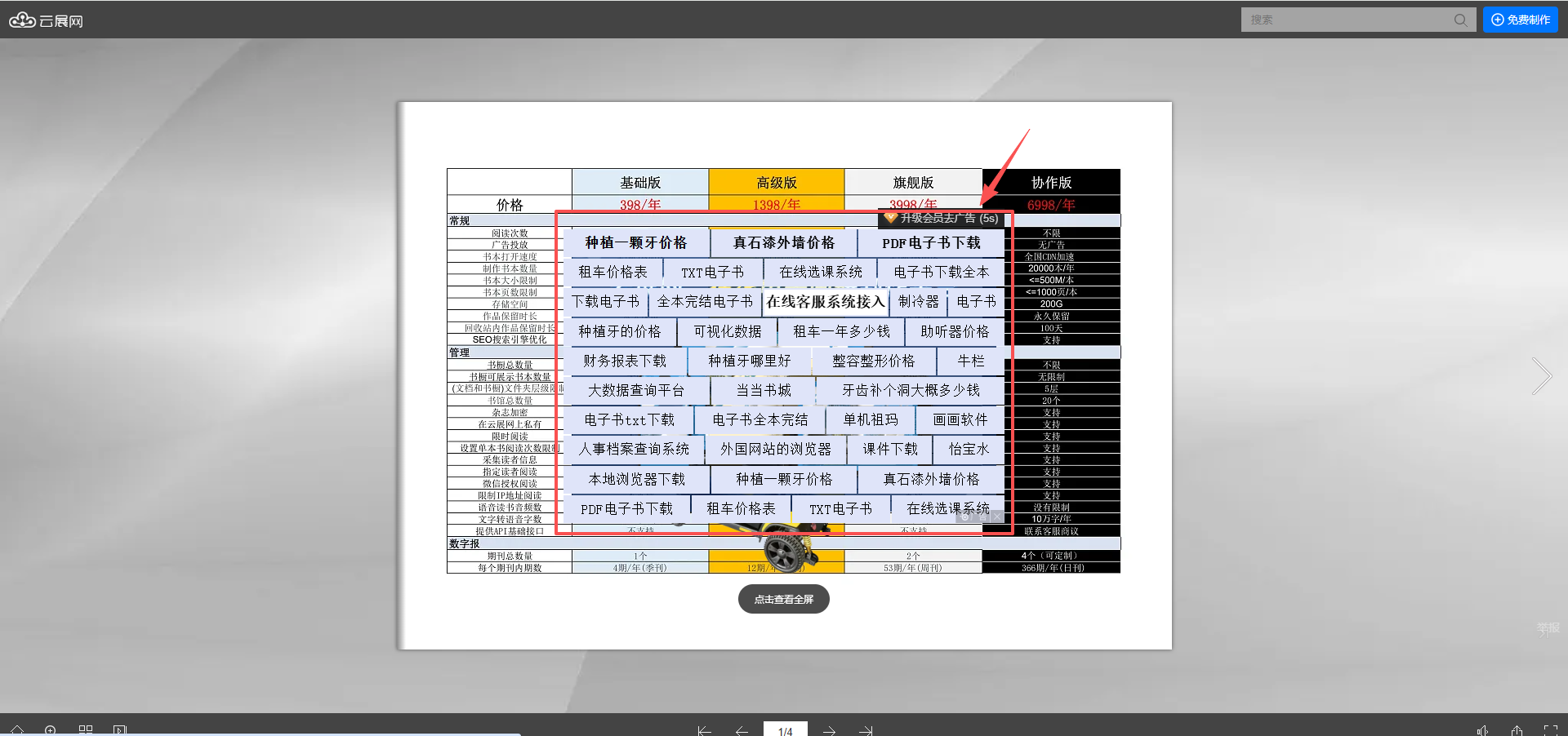 在使用云展網(wǎng)的過程中,如果帳號是免費版或者免廣告次數(shù)用完的話,那么就會在書本上加入廣告。