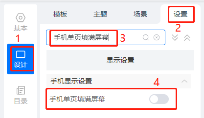 點(diǎn)擊【設(shè)計(jì)】,再點(diǎn)擊【設(shè)置】,打開【手機(jī)單頁(yè)填滿屏幕】