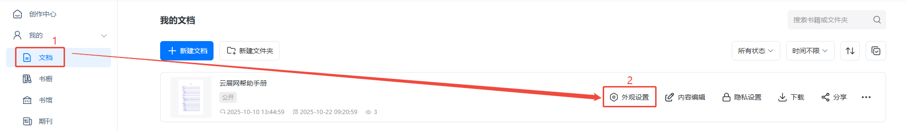在【文檔】找到需要設(shè)置的電子書,點(diǎn)擊【外觀設(shè)置】進(jìn)入。