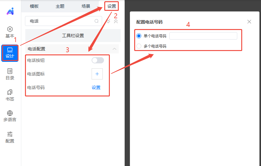 點(diǎn)擊【設(shè)計(jì)】,然后點(diǎn)擊【設(shè)置】,打開【電話按鈕】,有需要可以自定義【電話圖標(biāo)】,輸入單個(gè)電話號(hào)碼或者多個(gè)電話號(hào)碼。