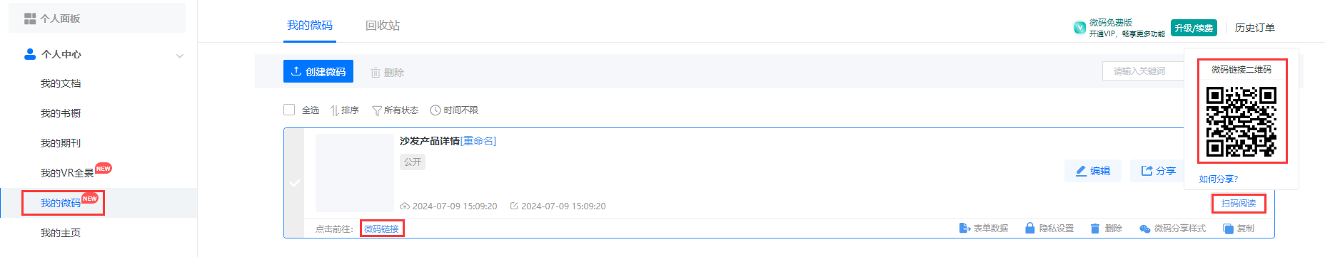 (1)點擊【我的微碼】,【微碼鏈接】可以獲取鏈接,【掃碼閱讀】可以獲取二維碼。
